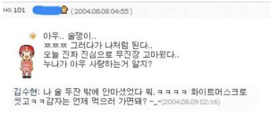김수현은 고등학생 시절부터 당시 유행하던 싸이월드에서 열심히 활동을 하고 있었는데요. 열일곱살때 친구들과 나눈 방명록이 화제가 되었죠.